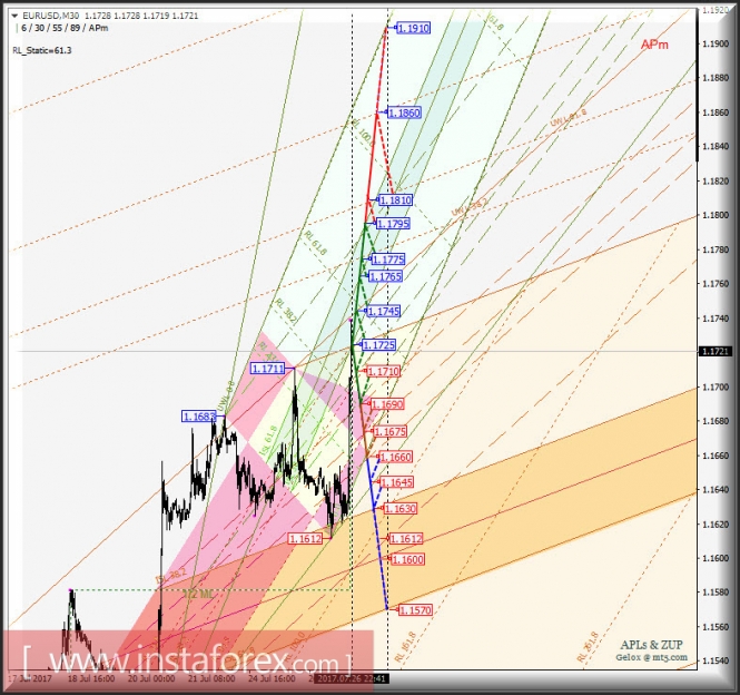 Индикатор MACD – красная линия и гистограмма с белыми барами в окне индикаторов.Материал предоставлен компанией InstaForex - www.instaforex.comEUR/USD m30. Развитие движения в период 27-28 июля 2017 г. Анализ APLs & ZUP.