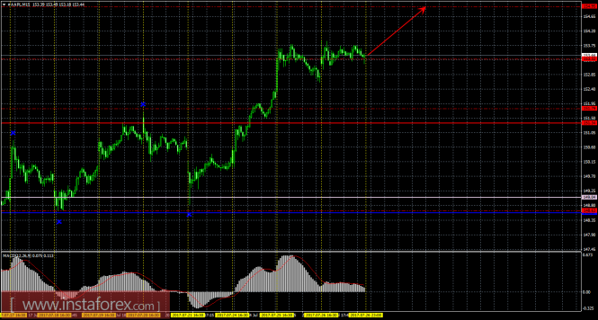 На 15-минутном графике рекомендуется рассматривать ордера на покупку с целью 154,95 при закреплении цены выше 153,32, ордером Stop Loss ниже 153,32 и при направленном вверх MACD.