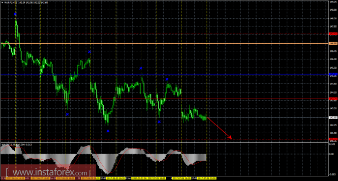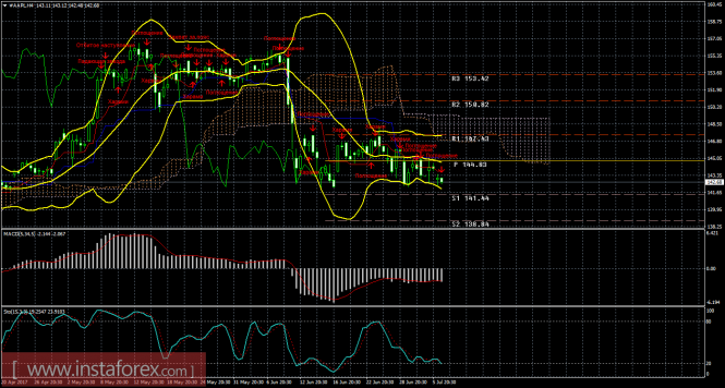 На 15-минутном графике рекомендуется рассматривать ордера на продажу с целью 141,44 при закреплении цены ниже 143,74 (Тенкан-сен), ордером Stop Loss выше 143,74 и при направленном вниз индикаторе MACD.