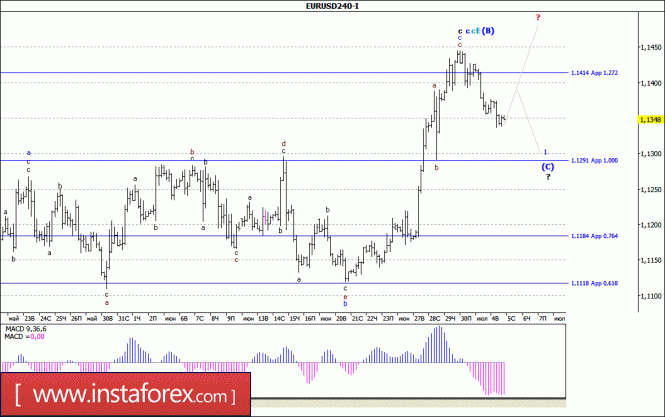 Валютная пара предположительно завершила построение волны (B), которая приняла довольно сложный вид. Сейчас возможно понижение котировок в рамках первых волн в составе будущей (С) с целями, расположенными около расчетных отметок 1,1291 и 1,1184, что приравнивается к 100,0% и 76,4% по Фибоначчи. Волна E, в (B) еще может усложниться еще больше, а повышение котировок возобновится с целями около 15 фигуры.Материал предоставлен компанией InstaForex - www.instaforex.comПозитивное для доллара содержание протокола ФРС его поддержит