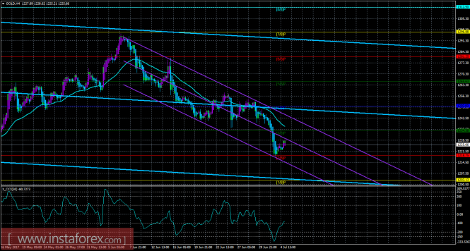 Хайкен Аши – индикатор, окрашивающий бары в голубой или фиолетовый цвета.Материал предоставлен компанией InstaForex - www.instaforex.comТехническая картина инструмента GOLD по системе «Каналы регрессии» за 5 июля 2017 года