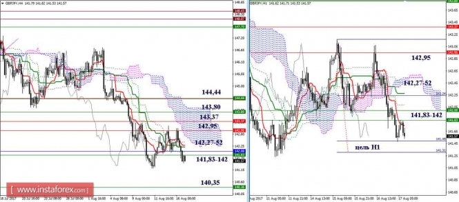 На младших таймфреймах пара исполнила по первому целевому ориентиру нисходящую цель на пробой облака Н1 и спустилась под поддержки (141,83-142), но для окончательной победы этого мало. Сейчас для игроков на понижение важно закрепиться не только под поддержками, но и под минимумом (141,23), подтвердив на старших таймах данные закрепления. Если медведи сейчас не смогут преодолеть притяжение и влияние поддержек (141,83-142), то нужно отметить сопротивления, которые способны повлиять на ситуацию. Ближайшие сопротивления это 142,27-52 (облако Н1 + Киджун Н1 + крест Н4), далее расположена широкая зона, образованная облаком Н4 и уровнями старших таймов (142,95 – 143,37 – 143,80 – 144,44).