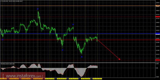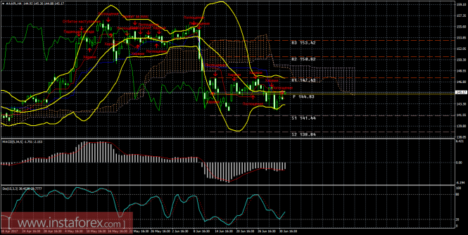На 15-минутном графике рекомендуется рассматривать ордера на продажу с целью 141,44 при закреплении цены ниже 144,23 (Тенкан-сен), ордером Stop Loss выше 144,23 и при направленном вниз индикаторе MACD.
