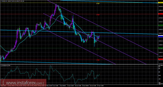 Хайкен Аши – индикатор, окрашивающий бары в голубой или фиолетовый цвета.Материал предоставлен компанией InstaForex - www.instaforex.comТехническая картина инструмента GOLD по системе «Каналы регрессии» за 28 июня 2017 года