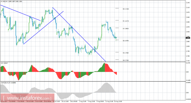 Красная линия и гистограмма с белыми барами в окне индикаторов.Материал предоставлен компанией InstaForex - www.instaforex.comТехнический анализ природного газа за 17 августа 2017 года