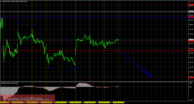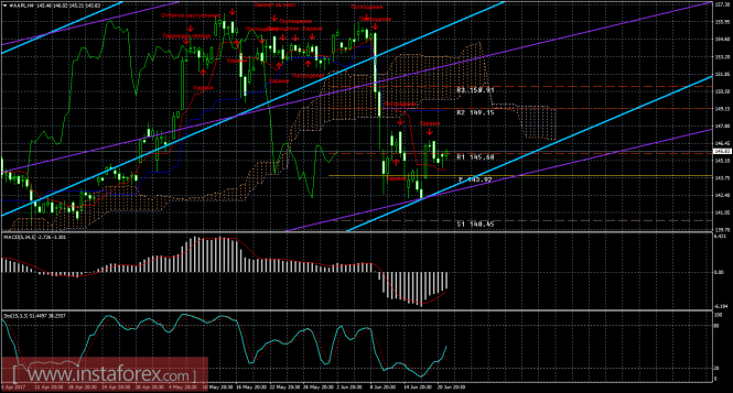 На 15-минутном графике рекомендуется рассматривать ордера на продажу с целью 140,45 при закреплении цены ниже 144,33(Тенкан-сен), ордером Stop Loss выше 144,33 и при направленном вниз MACD.