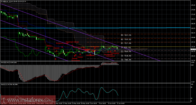 На младшем графике рекомендуется рассматривать ордера на покупку с целью 157,34 при закреплении цены выше Сенкоу Спан Б(154,93) и уровнем S/L ниже 154,93 и при направленном вверх индикаторе MACD.