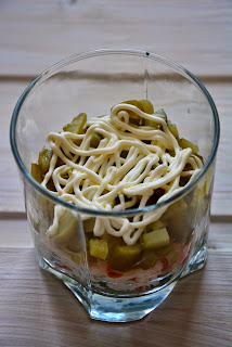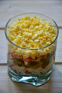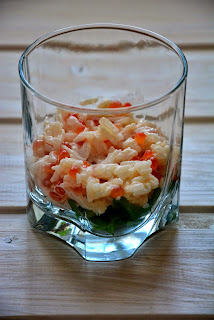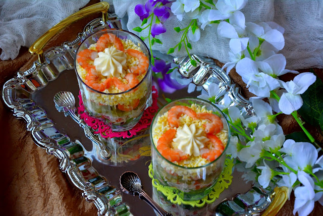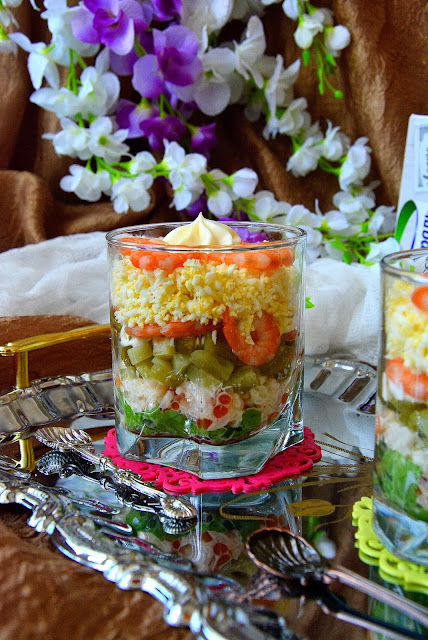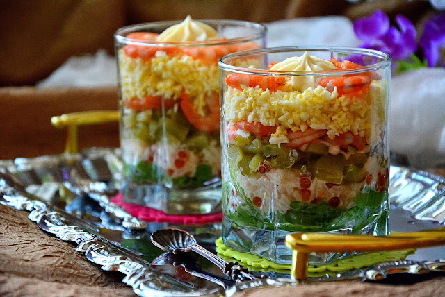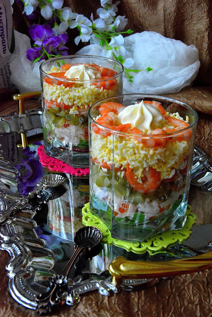 Предлагаю рецепт вкусного и изысканного салата, поданного в верринах (порционных стаканах).. Рецептик увидела у Лены Латушкиной.