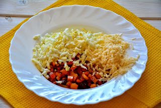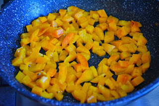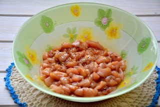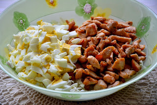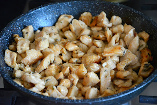 Затем добавить куриное мясо. Посолить при необходимости, добавить паприку. Обжарить до легкой золотой корочки, дать остыть