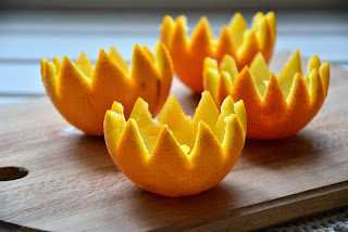 Пока маринуется мясо сделать корзиночки. Апельсин красиво разрезать на две части и аккуратно извлечь мякоть