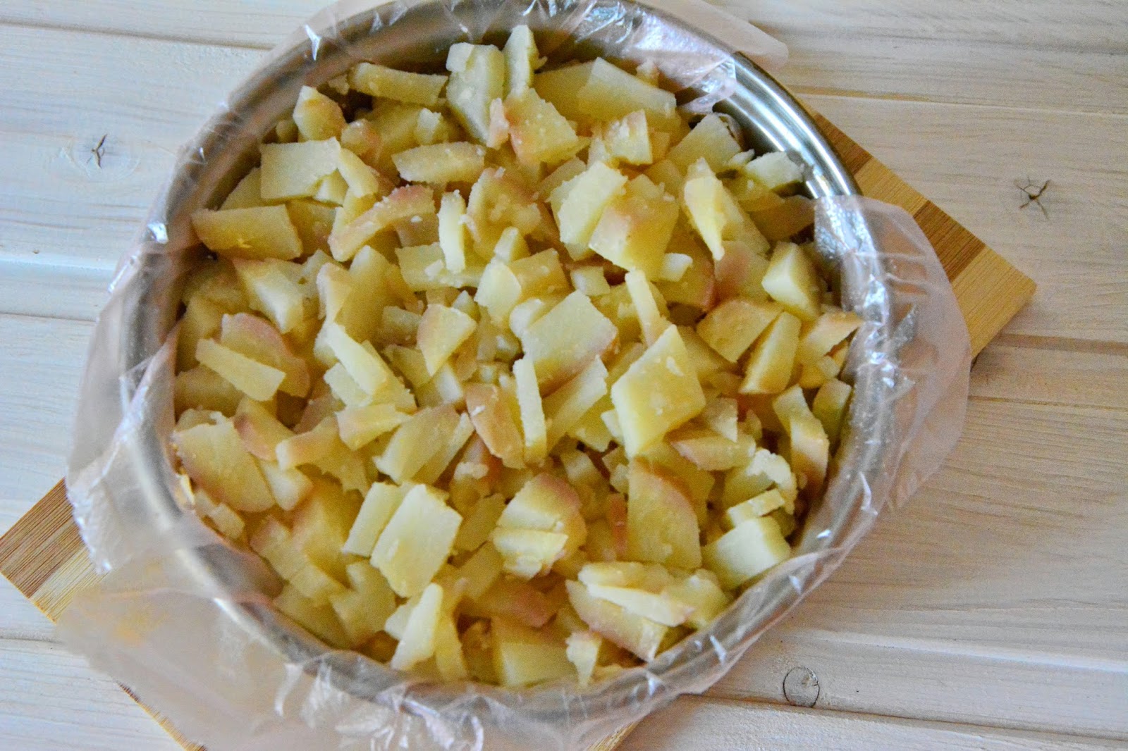 Куриное филе отварить заранее до готовности. Остудить, мелко нарезать