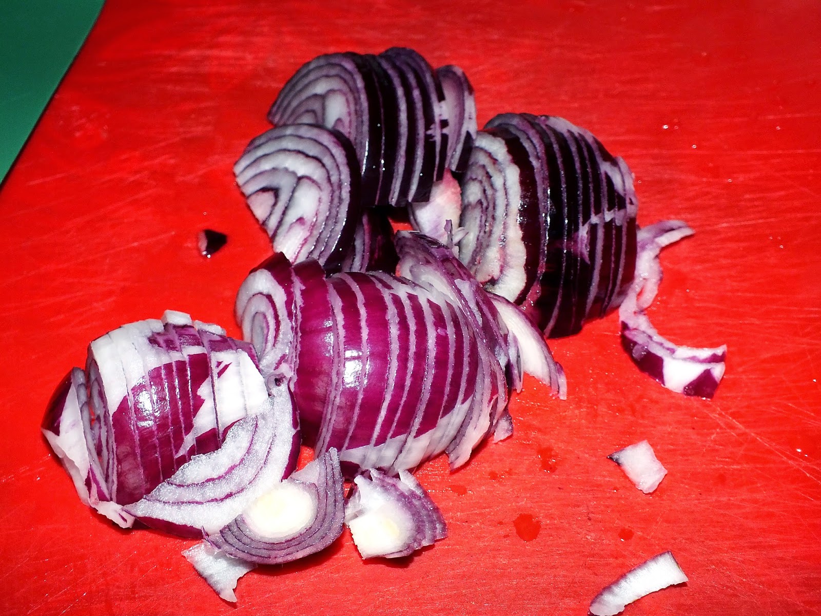 Пока жарятся крылья лук почистим и нарежем полукольцами (можно взять белый лук)