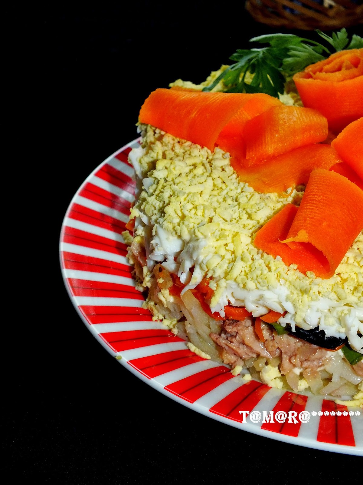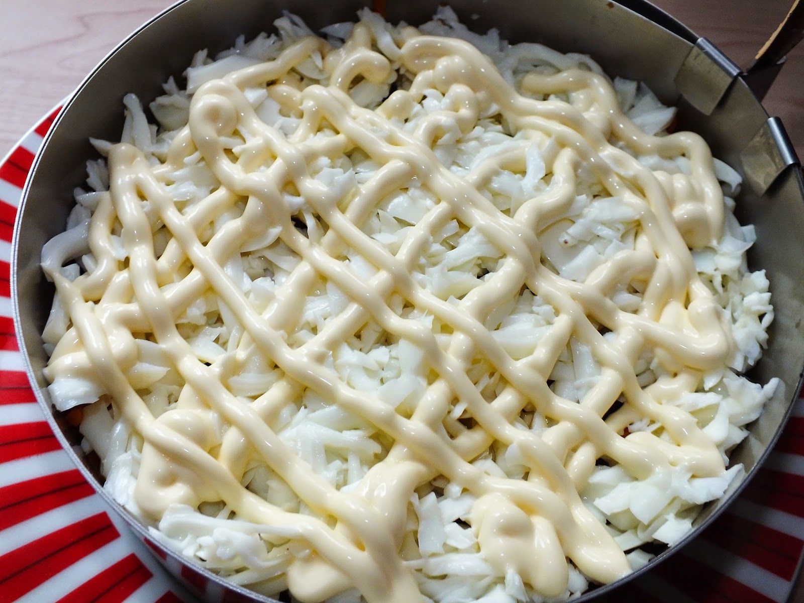 Следующим слоем идет морковь, натертая на крупной терке, сверху делаем сеточку из майонеза