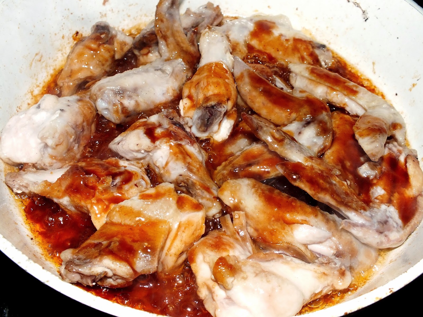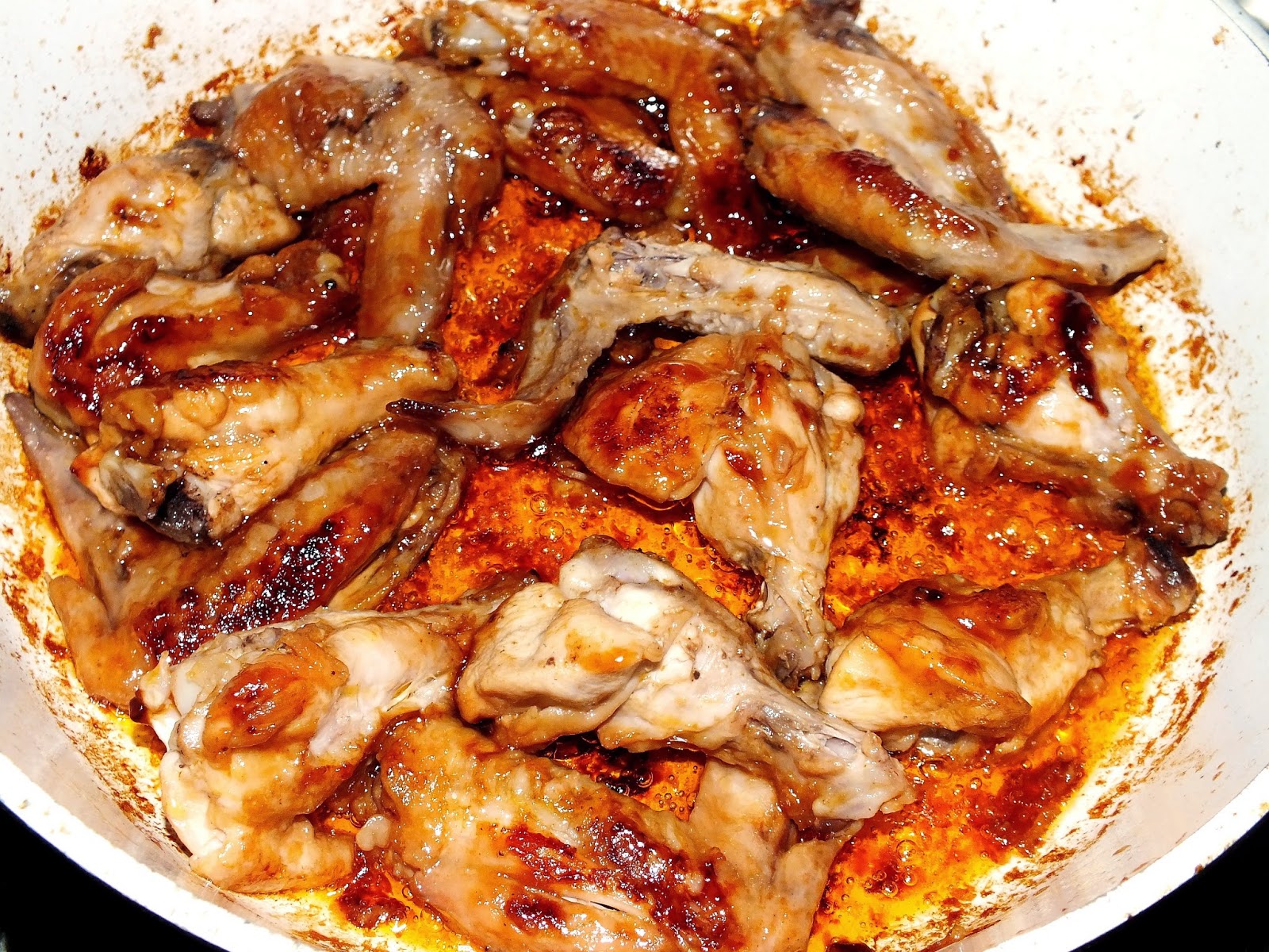 По истечению времени обжариваем уже с открытой крышкой, постоянно переворачивая крылья, пока соус не впитается