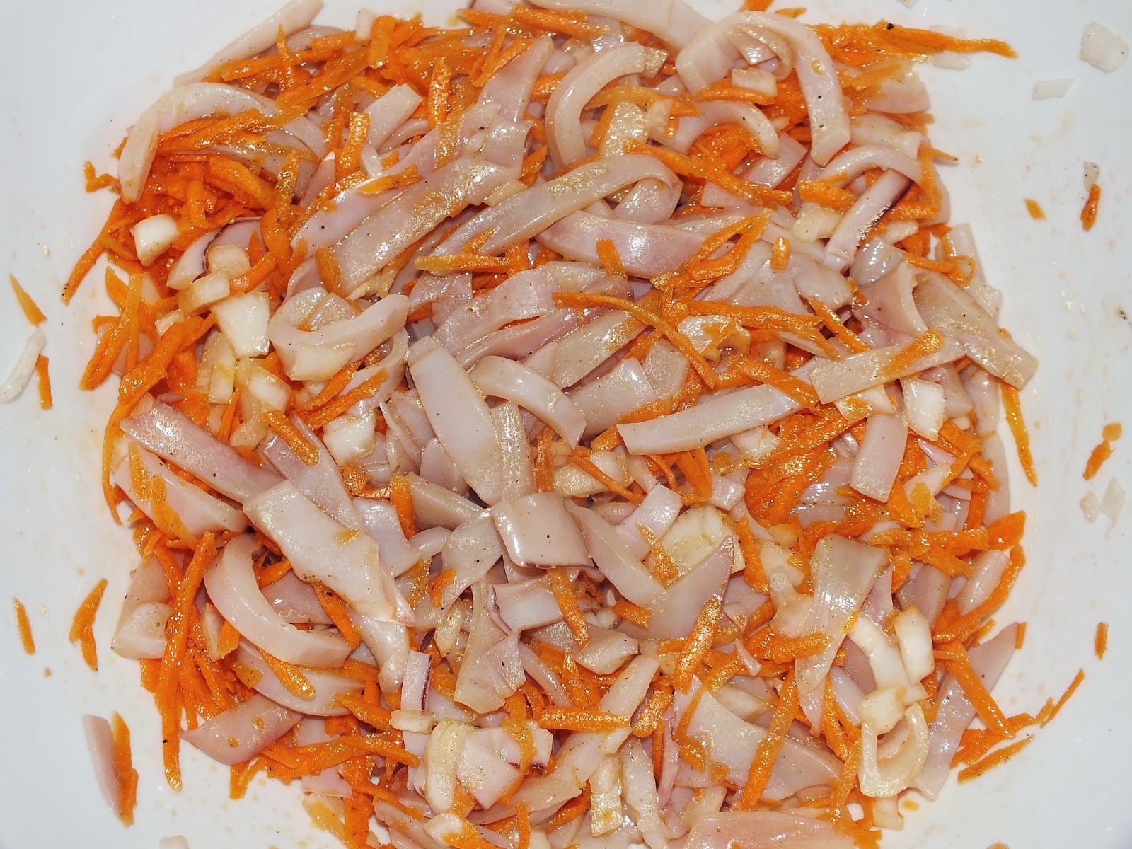 Затем режем кальмары полукольцами. Морковь чистим и трем на крупной терке. Лук порезать кубиком.