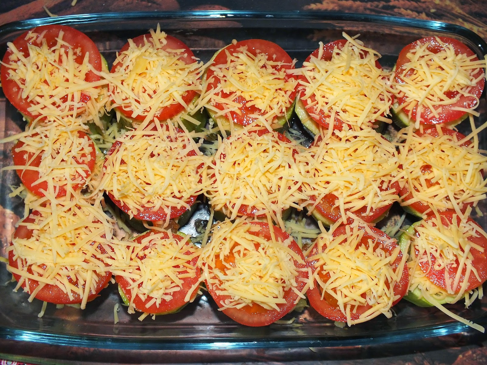Ставим в разогретую до 200* духовку минут на 20, затем достаем и выкладываем пластинки сыра (у меня обычный сливочный сыр, который я натерла на терке). Ставим опять минут на 5-10.