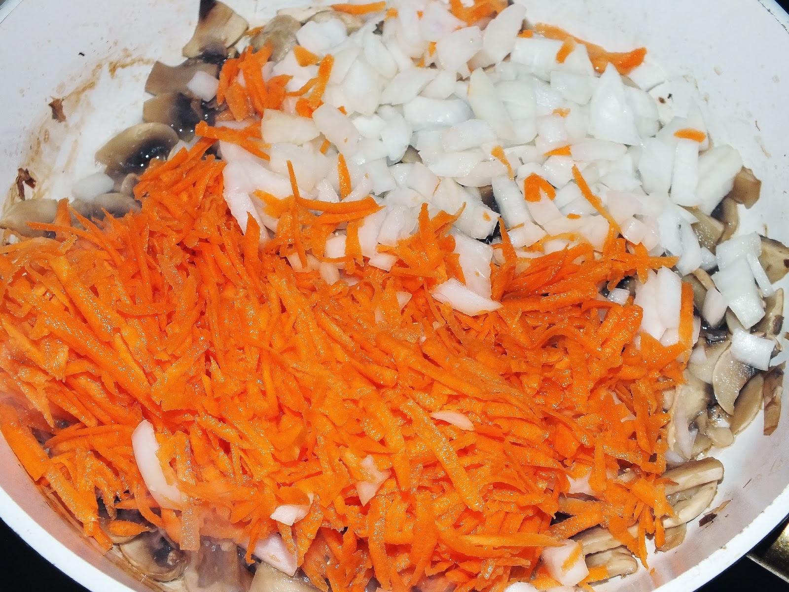 Пока варится рис, натрем морковь на терке, лук и сельдерей мелко режем. Спассеруем в растительном масле. Добавим чеснок, пропущенный через пресс.