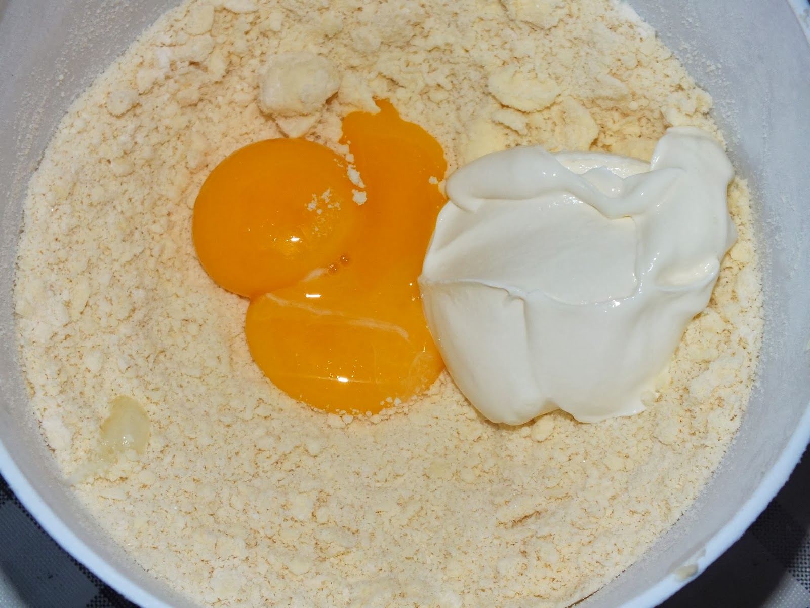 - Добавить сахар, яичные желтки и сметану. Сметану рекомендую добавлять по одной ложке (может понадобиться меньше, чем указано)