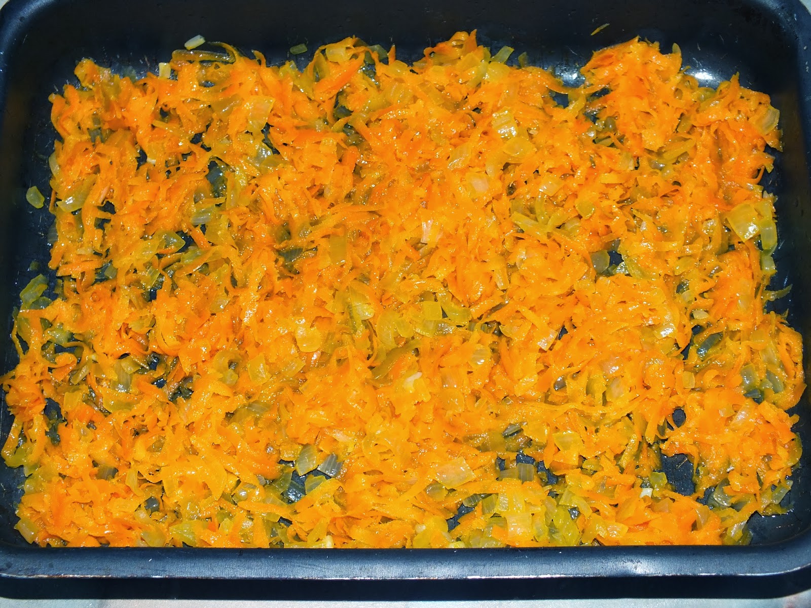 - Лук нарезать полукольцами и обжарить в растительном масле до золотистого цвета.
