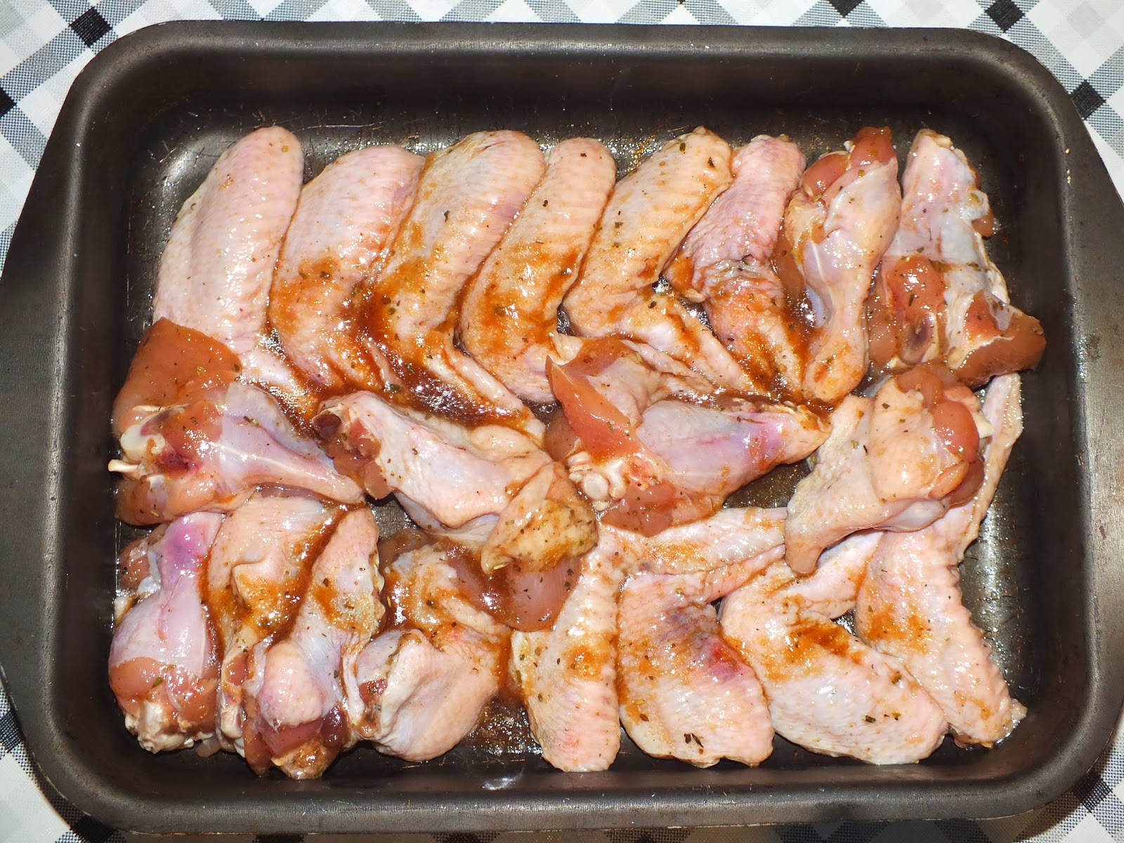 Выложить крылышки на смазанный противень и отправить в духовку на 30-40 минут при t-180* . Готовить до румяной корочки