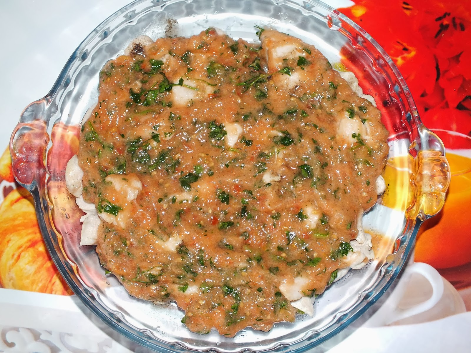 Делаем томатный соус. Помидоры ошпарить кипятком, снять кожицу, измельчить в блендере (или мясорубке), добавить нарезанную зелень, чеснок пропущенный через чеснокодавку, посолить и поперчить. Если у вас томаты не мясистые - советую сначала выпарить жидкость (на сковороде), иначе получится так, что при запекании они дадут очень много сока.