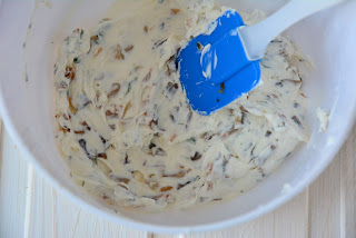 В сливочный творожный сыр выложить грибы, рубленную зелень, пропущенный через чеснокодавку чеснок. Перемешать