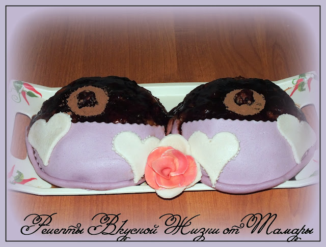 - Чтобы сделать бюстик, мастику раскатываем тонким пластом и вырезаем нужную форму. В менее откровенном варианте форму бюстгалтера вырезаем несколько больше, чтобы она закрывала сосок. Между собой детали украшения смачиваем водой для их склеивания. А вообще любое украшение зависит от Вашей фантазии. Даем торту пропитаться при комнатной температуре.