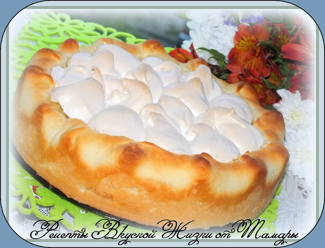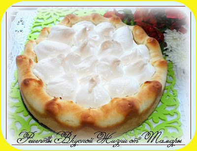 - Формируем пирог. В форму выложить тесто, сделать бортики, присыпать дно крахмалом и выложить апельсиновую начинку, на нее выложить белковый крем и дать время на расстойку. Затем отправить пирог в горячую духовку на 25 минут при температуре 180*.