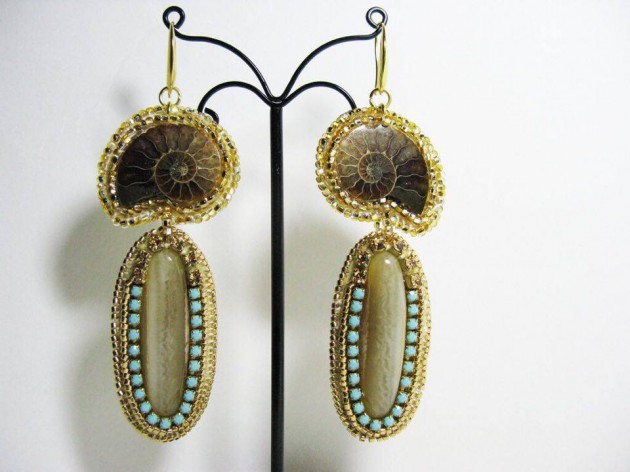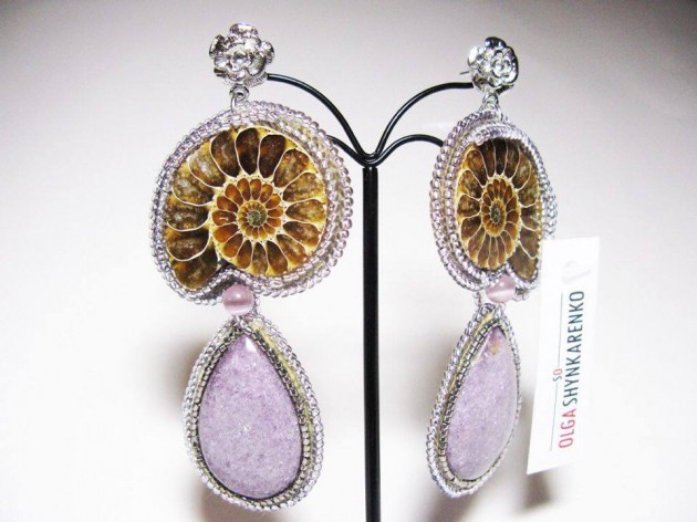 Эти ракушки, обрамленные бисером элитных сортов, в том числе и покрытым 24-каратным золотом, стали основой для сережек из новой коллекции. Достойную пару аммонитам составили агаты, лепидолиты и кристаллы Swarovski. Интересна и модель, которую украсили крылья жука-златки. Столь необычный декор способен восхитить и обратить внимание на вас!