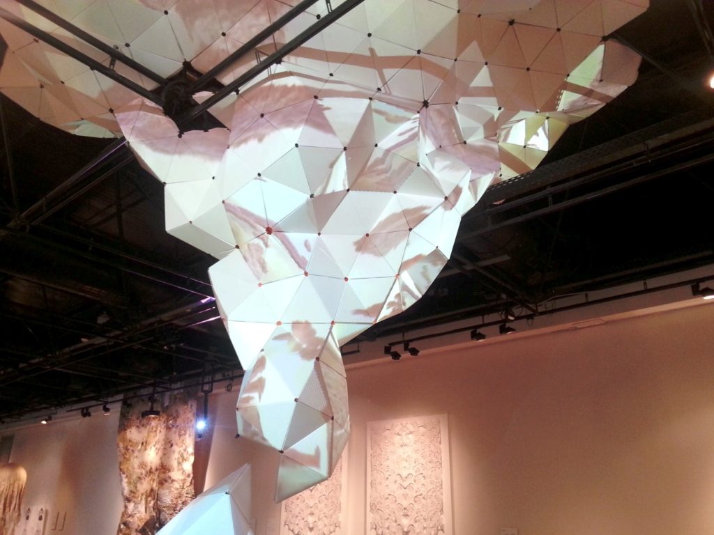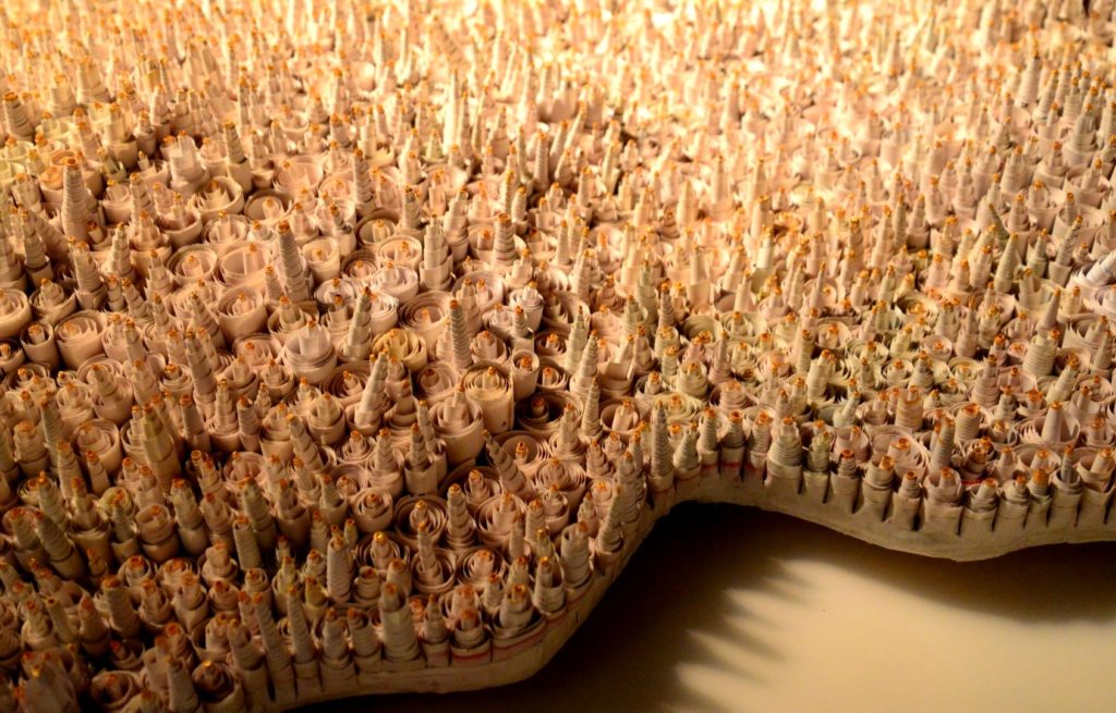 Вот несколько примеров: работы Харель Бен-Нуна, летчика по профессии, занимающего отображением на трехмерные объекты из бумаги, то есть аэрофотосъемкой, картографированием и созданием проекции пространства в сочетании со звуковым сопровождением. Его мерцающая башня от пола до потолка, состоящая из отдельных гнезд-панелей не может не заворожить.