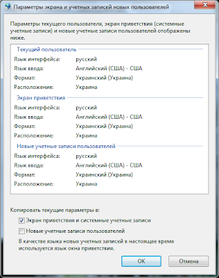 Чтобы скопировать текущие настройки в учетную запись пользователя по умолчанию, следует поставить флажок Стандартная учетная запись пользователя (новые пользователи). Учетная запись по умолчанию используется как шаблон для создания новых учетных записей пользователя. Эта настройка позволяет администраторам устанавливать формат, раскладку клавиатуры и язык интерфейса для новых пользователей. После установки этих настроек для учетной записи по умолчанию они будут применяться к любой новой учетной записи, созданной на данном компьютере. На существующие учетные записи это не повлияет.