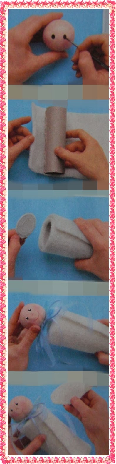 2.Для небольших фигурок ангелов использовать более узкую деталь шерстяного флиса,для более крупных фигурок-более широкую.Флис разрезать,соотвественно,на детали длиной 30-40 см.Соответсвенно ширине детали из флиса укоротить ролики из под бумажных полотенец.Затем согл.фото один из продольных срезов детали из флиса приклеить и оставить на короткое время подсохнуть.После этого деталью из флиса обернуть подготовленный ролик и приклеить к нему по нижнему краю в нескольких местах.шаг№2Мастер-класс Декоративное украшение на кухню