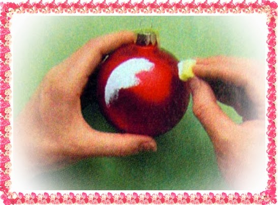 1.Перед началом работы все шары почистить специальными средством для чистки стекла и оставить до высыхания.Одну часть каждого шара покрасить акриловой краской.Но сначала на шаре нарисовать с помощью круглого шаблона и белого лакового карандаша круг,при этом обратить внимание на то,чтобы петелька для подвешивания шара была направлена на вверх(как вариант:начертить на толстом картоне круг с помощью циркуля и вырезать макетным ножом).Затем аккуратно вырезанным кусочком губки взять немного белой краски и на вычерченном круге поставить точки.(шаг1).