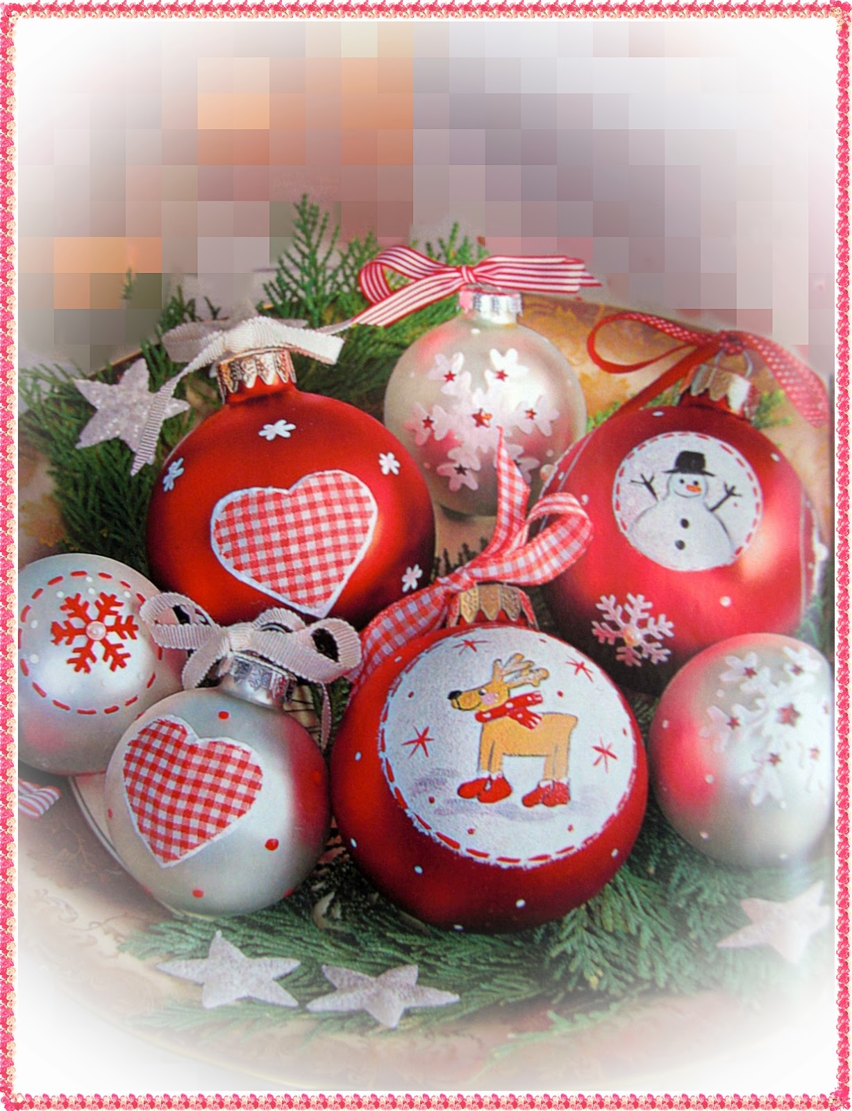5.Маленькое сердечко вырезать с помощью мотива из клетчатой ленты,большое сердечко-из белой бумаги из коры шелковицы.Сердечки наклеить последовательно друг за другом на шары.С помощью лаковых карандашей нарисовать звездочки и снежинки.К каждому шару подобрать соотвтсвующую тесьму,завязать бантики,бантики наклеить на петли подвешивания с помощью горячего клея.