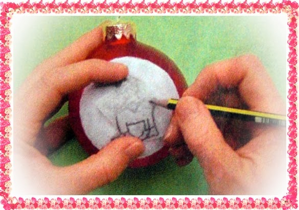 2.С листа мотивов увеличить до нужного размера фигурки оленя и снеговика,перевести на кальку,вырезать на некотором растоянии от контура.Затем шаблон перевернуть,заднюю сторону заштриховать мягким простым карандашом и по контору слегка надсечь.Теперь шаблон наложить на шар,прижать одной рукой,другой рукой твердым простым карандашом обвести контур.(шаг2).