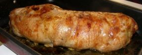 затем убираем фольгу и выпекаем еще 10-15 минут. Вынимаем готовый рулет из духовки, даем остыть, аккуратно снимаем нить, если зашивали, убираем зубочистки. Нарезаем рулет на нетолстые кусочки.
