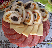 Ну и два салатиказатем убираем фольгу и выпекаем еще 10-15 минут. Вынимаем готовый рулет из духовки, даем остыть, аккуратно снимаем нить, если зашивали, убираем зубочистки. Нарезаем рулет на нетолстые кусочки.