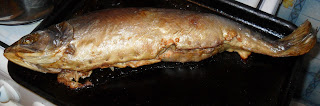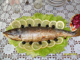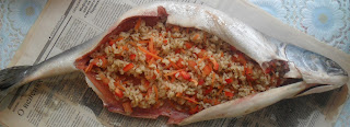 Болгарский перец мелко или соломкой нарезаем, добавляем мелко нарезанный лук и рис, морковь по корейски. Солим. При желании перчим. Перемешиваем. Кладем сырое яйцо. Еще раз тщательно мешаем. И выкладываем массу внутрь рыбки. Зашиваем брюшко обыкновенной иголкой и простой ниткой. Я скрепляю края зубочистками.