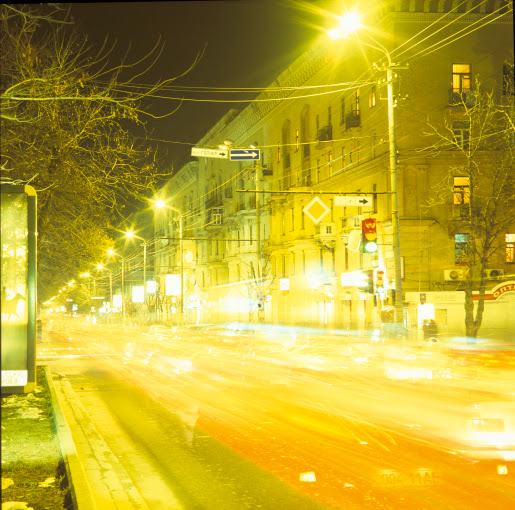 Этот поворот. Аж искры света. Никого нет, а движение света и красок эффектно и гармонично. Как природно на фото сочетаются оттенки зеленого и желто - оранжевого цвета. Цветовые блики выделяют этот колоннообразный фасад входа в здание на фоне черного неба. Рука мастера Куличенко видна и на этом фото г, Днепропетровска.