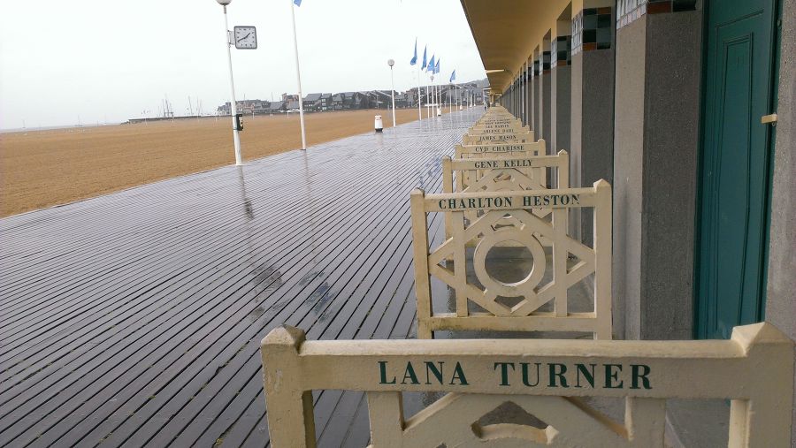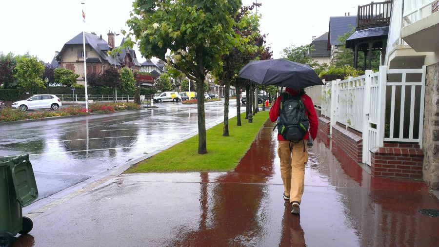 Не зря, видимо, на туристических сувенирах местные жители обязательно изображаются с зонтами (или в дождевиках) и резиновых сапогах. Сегодня у нас погода совершенно неподходящая для прогулок. Однако, доехав до Довиля, решили хотя бы что-то посмотреть, прогулявшись под настойчиво барабанящим дождем.