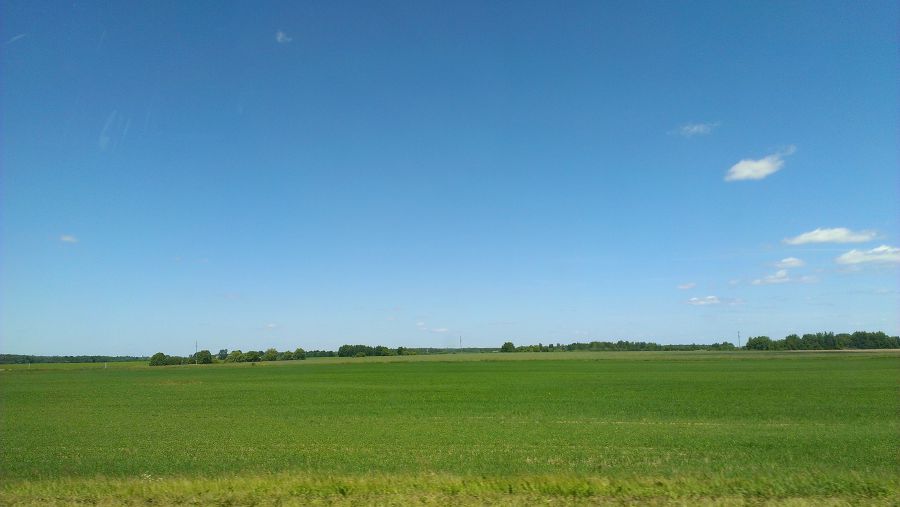 Неужели вся страна примерно так выглядит? Проехали Беларусь по диагонали и везде сплошь ухоженные засеянные поля. Вот это отношение к сельскому хозяйству! Вообще, создалось ощущение, что здесь везде царит порядок и чистота. Конечно, ничего мы увидеть не успели, но захотелось пару недель провести хотя бы в Минске и осмотреться.