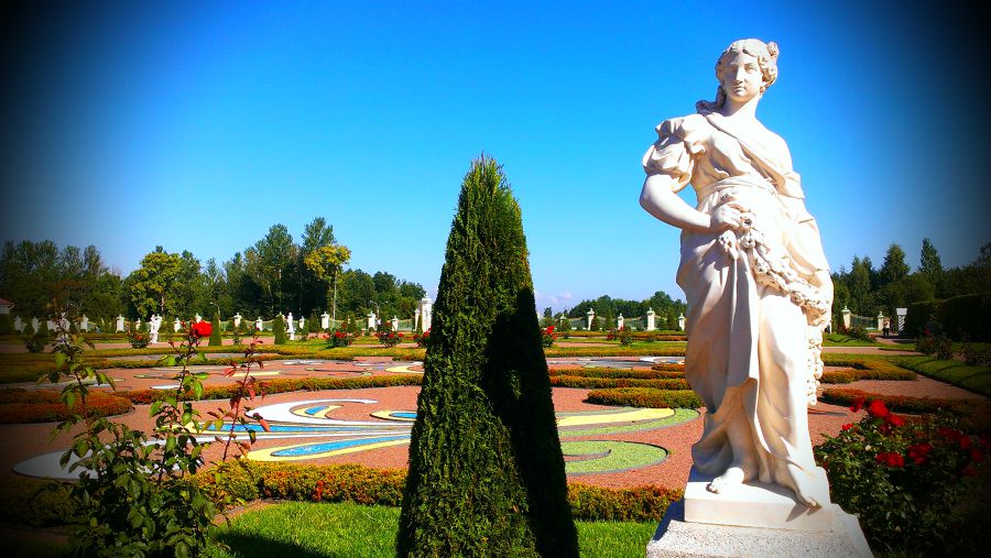 Погода ясная и солнечная, от чего все вокруг пылает красками. Насыщенную зелень и яркие цветы дополняют белоснежные статуи. Хороший материал мрамор — даже птицы его не трогают. Интересно, почему?