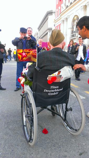 Вот такая ирония судьбы — ветеран в немецкой инвалидной коляске фирмы «Titan Deutschland GmbH». Всё верно, дружить всем надо, а не воевать.