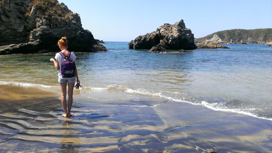 Недалеко от нашей деревушки Масунте есть симпатичное местечко, которое нам приглянулось в прошлый визит, когда мы для путеводителя информацию собирали. Сегодня дошлепали до него. Ше очень понравился местный черно-фиолетовый песок.