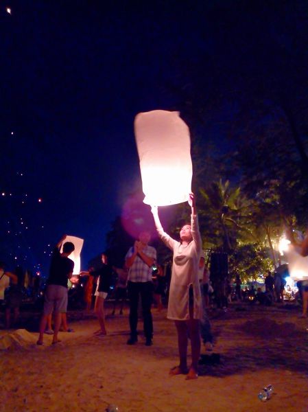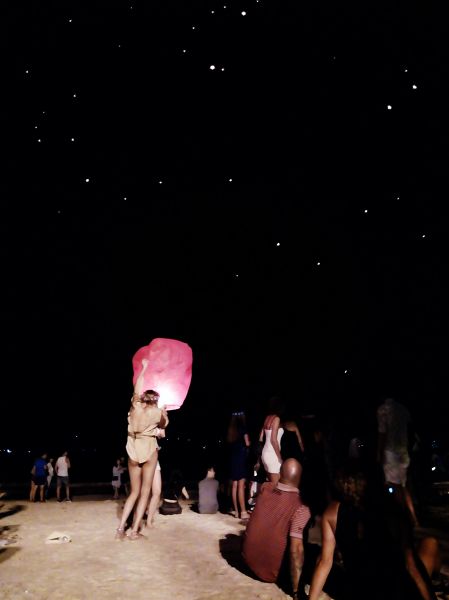 Все, как положено: фейерверки, левитирующие фонарики и крики «С Новым годом!», легко заглушающие скромные «Хэппи нью еар!». Белые точки на небе — это не звезды, а именно мириады летящих фонариков.