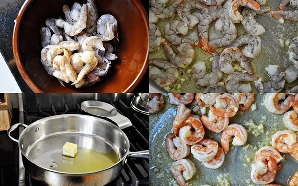 4. Растопите сливочное масло. Добавьте чеснок и оставьте томиться на1-2 минуты. Выложите приготовленные очищенные креветки, посолите и поперчите. Готовьте около 5 минут, пока креветки не приобретут розовыйоттенок.Снимите с огня.