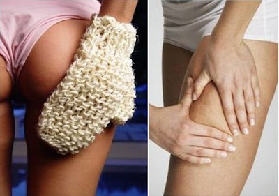 - Отшелушивание и очищение кожи очень важно. Во-первых, это идет на пользу всем обменным процессам, очищенная кожа лучше дышит или обновляется. Во-вторых, значительно лучше воспринимает любое воздействие, отлично впитывает эмульсии и кремы. Проводить процедуру лучше в ванной, во время душа. Возьмите жесткую мочалку или рукавичку из натуральных материалов. И начинайте растирать сухую кожу, поврежденную целлюлитом. Да, вы не ослышались. Именно сухую кожу. Очень скоро вы заметите, как кожа покраснела и разогрелась. Растирайте в течение минут 10 – 15. Затем, под душем, повторите процедуру уже с мокрой мочалкой. Эта процедура прекрасно отшелушивает мертвые клетки и повышает микроциркуляцию под кожей.