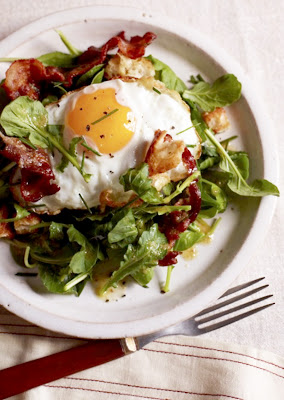 3. Крупно порвать руками салат, добавить оливковое масло, сок половины лимона, соль, перец. Перемешать. Выложить на тарелку слоями листья салата, хлеб с беконом, яйца, присыпать сыром, натертым хлопьями.