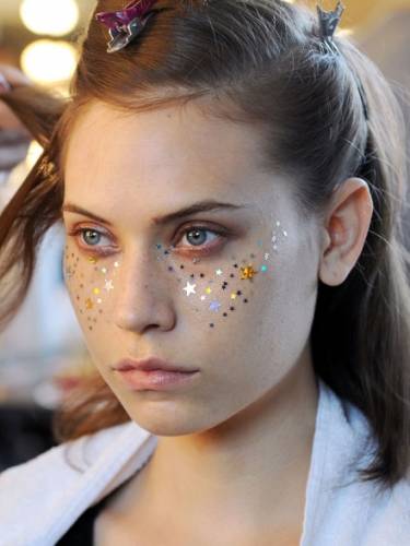 Мы видели невероятное количество звезд на этой неделе и, нет, не на звездном небе. Они были на лицах и телах моделей! Первый такой "звездный" образ появился у A Detacher, где дизайнер Мона Ковальска (Mona Kowalska) дала такую установку команде дизайнеров и стилистов - "детская скука". Так, эта установка постепенно перешла на макияж глаз, передающий детский сон через эти крохотные звездочки на скулах моделей. Образ получился не слишком милым, и, в общем и целом, получает круглую пятерку за ...