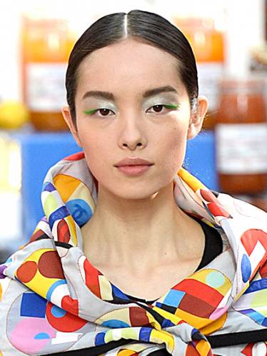 Кожа моделей выглядела очень свежо и мягко с таким легким персиковым румянцем на щеках и таким же цветом губ. Чтобы макияж сочетался с дизайнерскими графическими принтами, визажисты нарисовали на глазах моделей флуоресц...